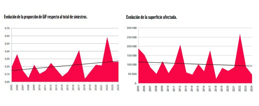 La proporción de fuegos que superan las 500 hectáreas ha aumentado y, con ellos, el riesgo para personas, ecosistemas y poblaciones. La crisis climática, unida al abandono rural y a la acumulación de combustible vegetal, ha dado lugar a un nuevo escenario de incendios extremos que desbordan la capacidad de extinción.